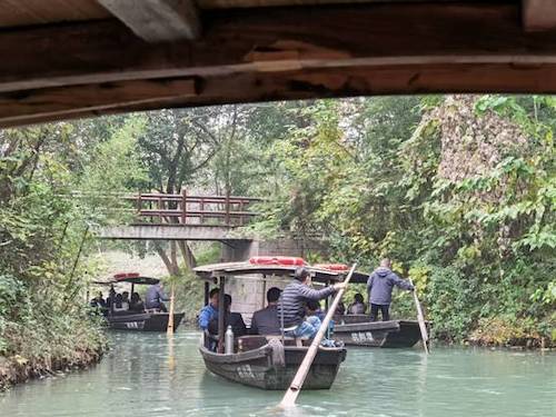 秋风徐徐,秋日的杭州西溪国家湿地公园宛如一幅江南写意画。河道蜿蜒,小桥流水,桥底时不时飘过几艘摇橹船,这是独属于西溪的秋日浪漫。西溪湿地是感受秋色的好地方,有红柿,有遍地的黄叶,也有枯萎的残荷。“夹岸复连沙,枝枝摇浪花”,眼下,雪白的芦花正陆续绽放,绵延的芦苇荡更是不能错过的一道亮丽风景,这为秋日西溪增添了别样的美感。处处都是红黄绿多重色彩组合的视觉世界,怎能不令人享受呢?空气清新,水雾氤氲,老师们坐在晃晃悠悠的摇橹船上,不知不觉中度过了怡然惬意的半天。休闲玩乐间,拉近了彼此的距离,游赏湖光山色时,彼此交流心得,增进感情,对数学学院的前景进行展望,这次旅行给每个⼈都留下了非常深刻的印象。