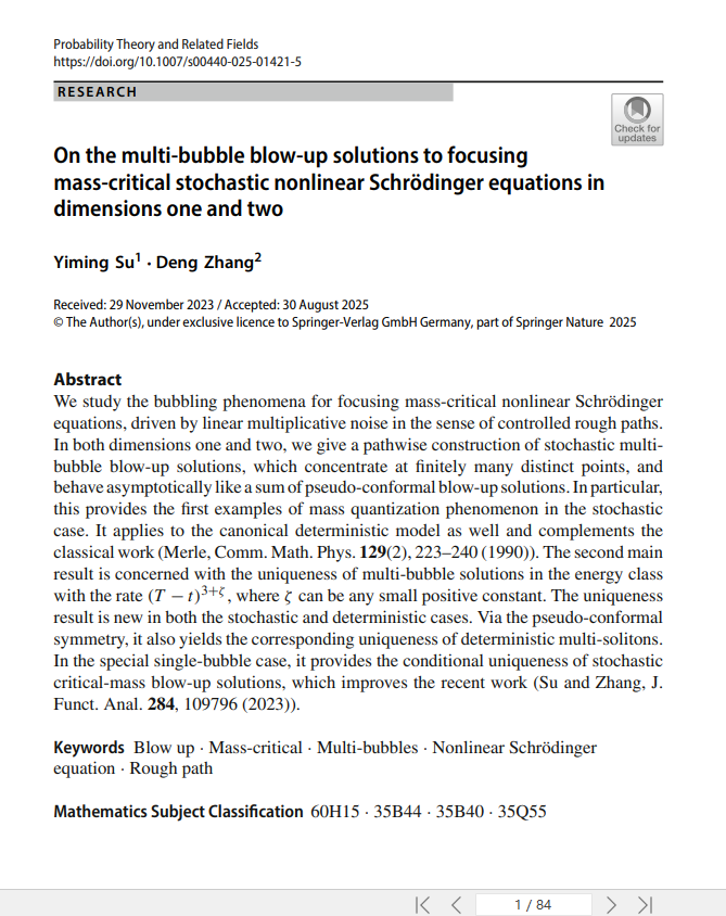 近日,苏一鸣教授与上海交通大学张登教授合作,在国际概率论顶刊《Probability Theory and Related Fields》发表题为“On the multi-bubble blow-up solutions to focusing mass-critical stochastic nonlinear Schrödinger equations in dimensions one and two”的学术论文。该论文长达84页,研究了质量临界的随机非线性薛定谔方程,构造出随机多波包爆破解并在一定的渐近条件下证明了该类解的唯一性。值得指出的是,多波包爆破解的渐近唯一性即使在确定情形下也是首次得到。这是自法国著名数学家、ICM一小时报告人Frank Merle在1990年完成该类解的构造以来的第一个唯一性结果。