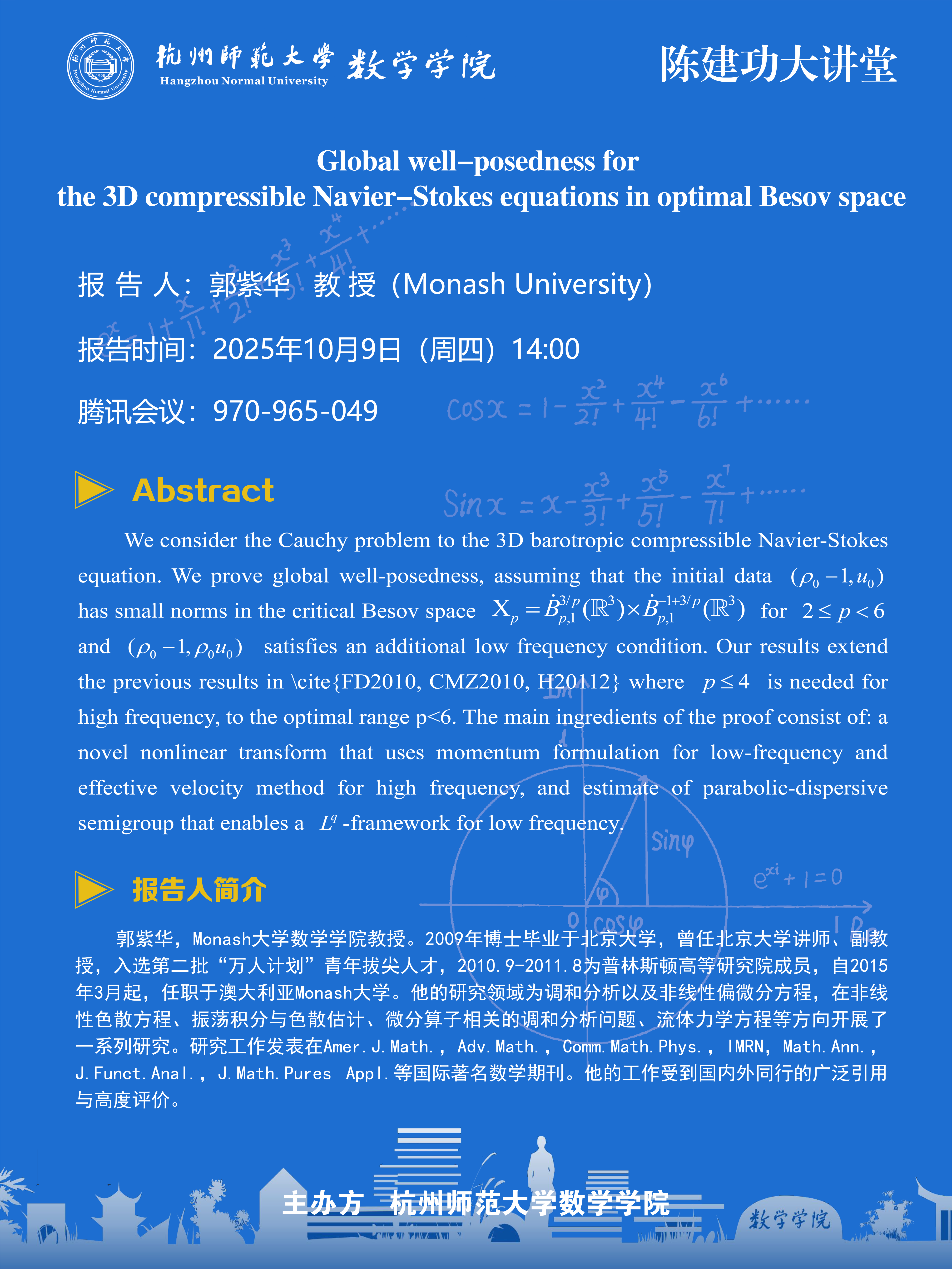 陈建功大讲堂(2025-84):Globalwell-posednessforthe3DcompressibleNavier-Stokesequationsin optimalBesovspace