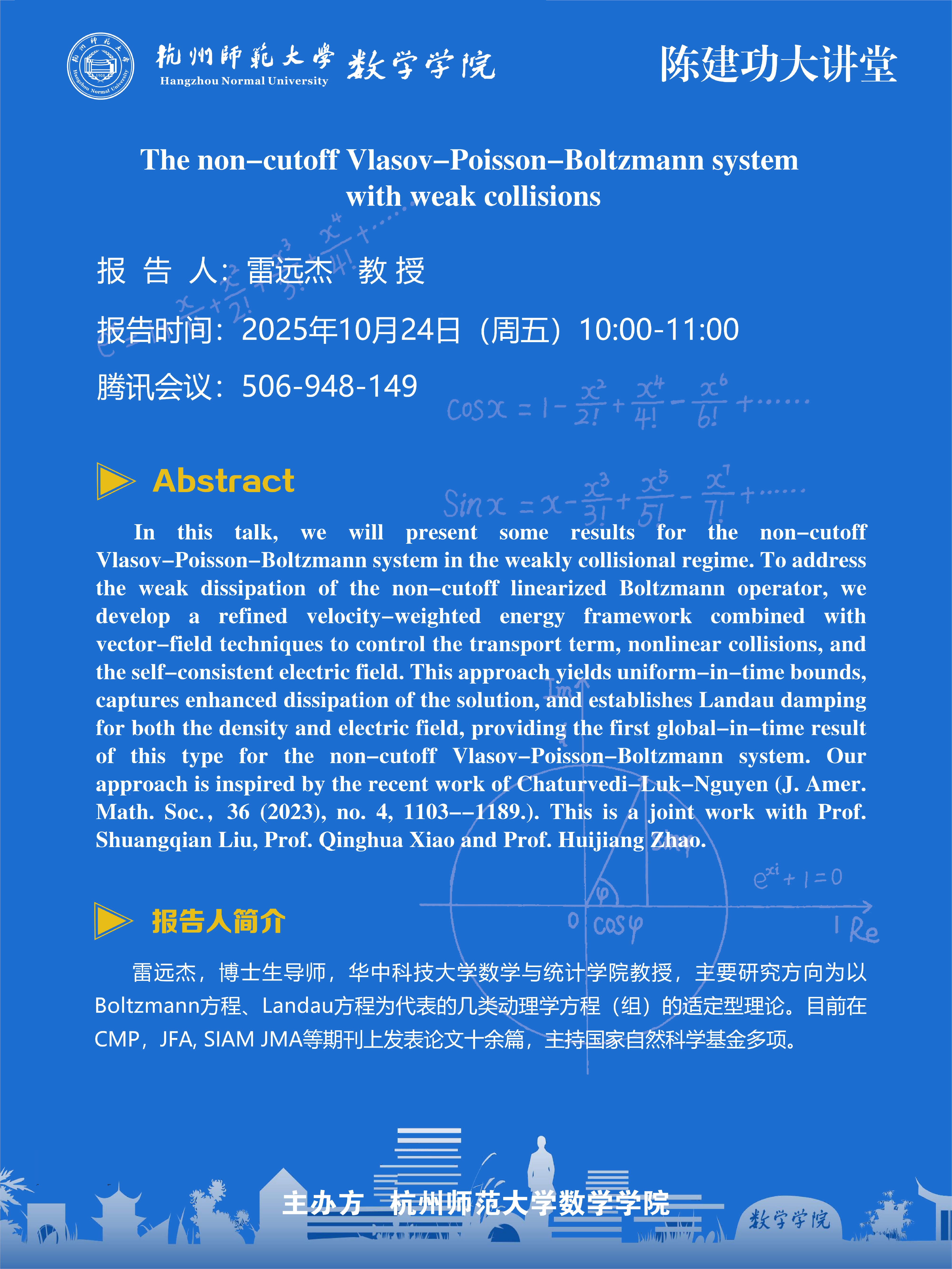 陈建功大讲堂(2025-100):The non-cutoff Vlasov-Poisson-Boltzmann system with weak collisions