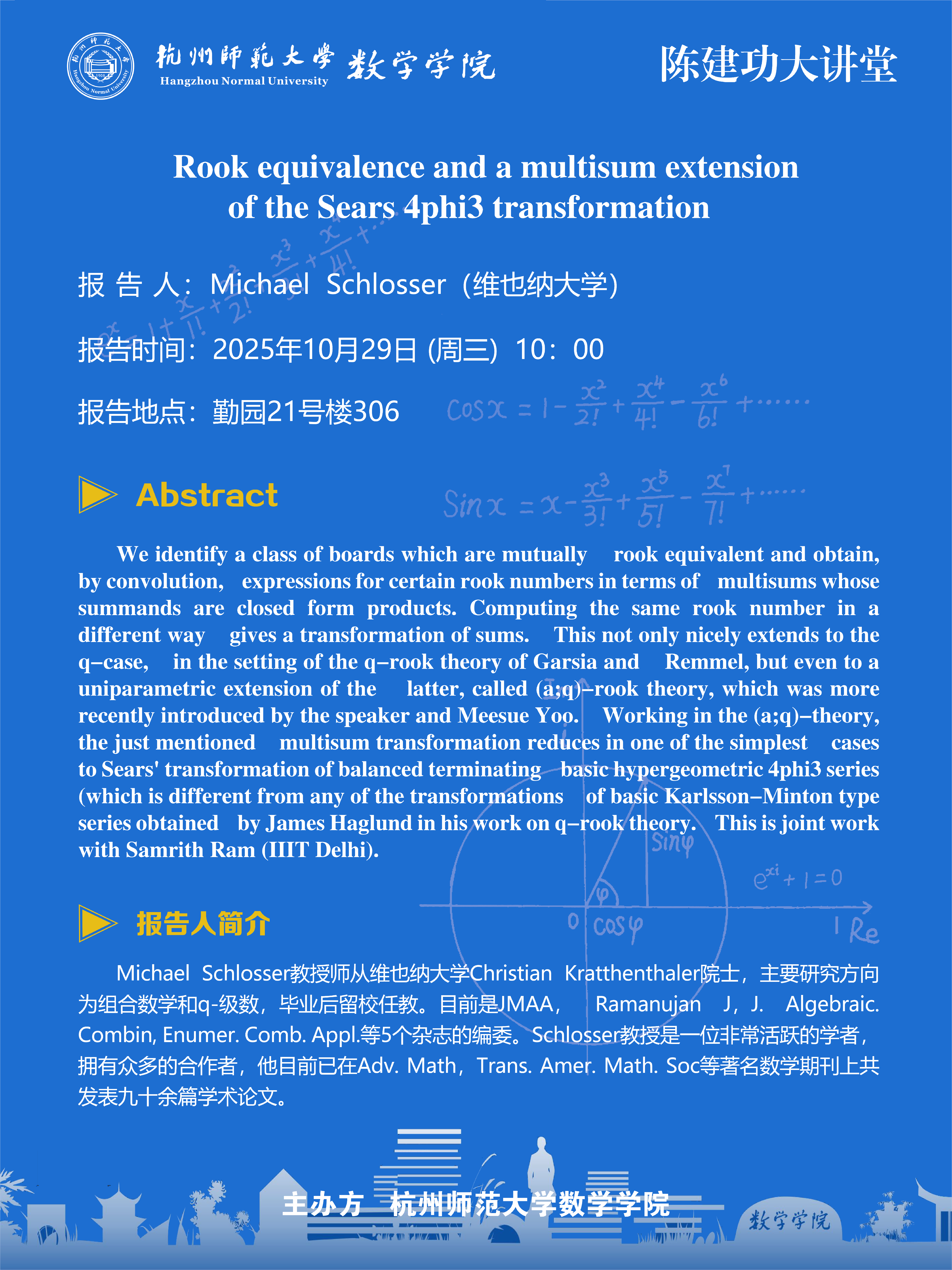 陈建功大讲堂(2025-105):Rook equivalence and a multisum extension of the Sears 4phi3 transformation