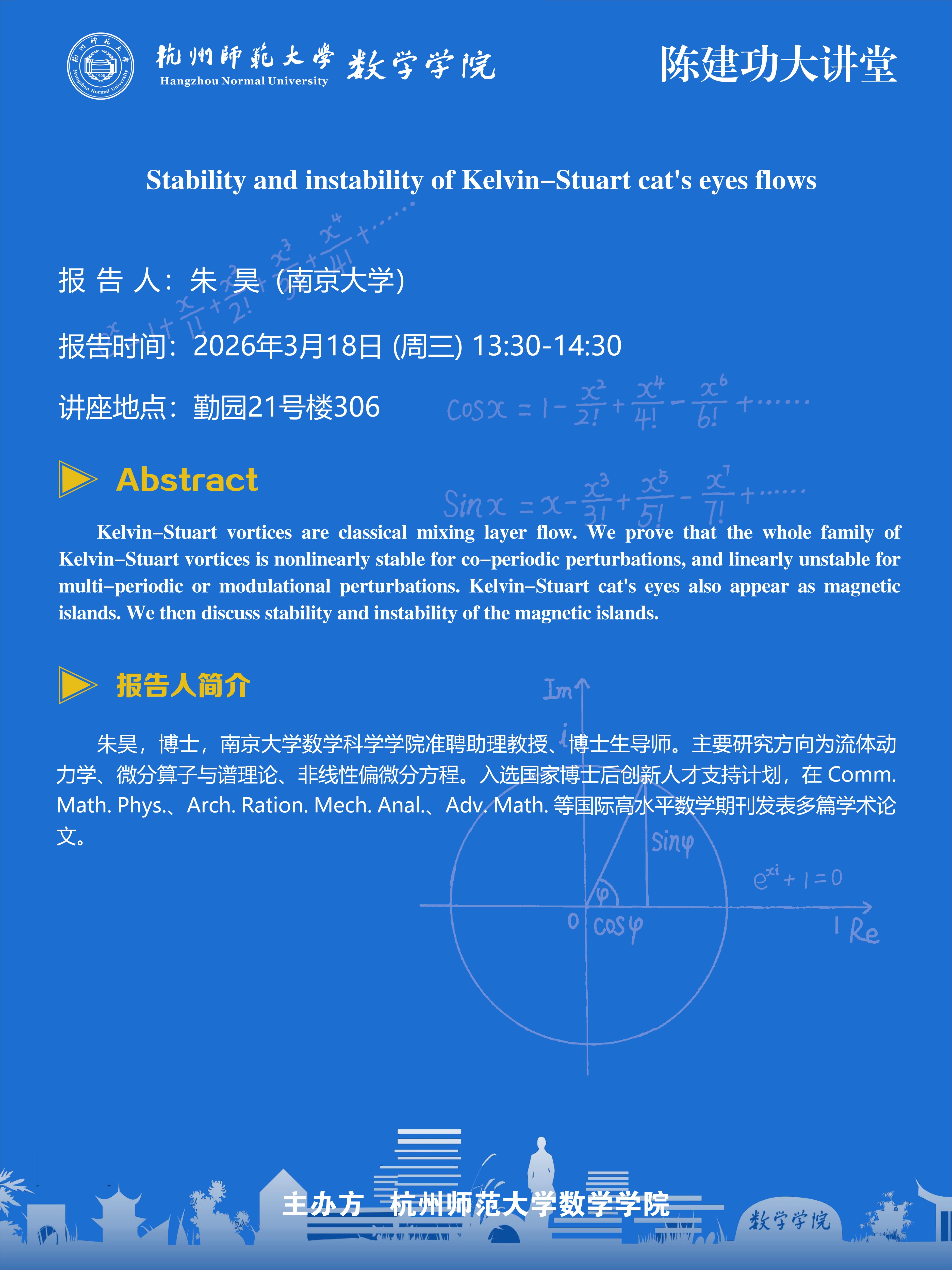 陈建功大讲堂(2026-8):Stability and instability of Kelvin-Stuart cat's eyes flows