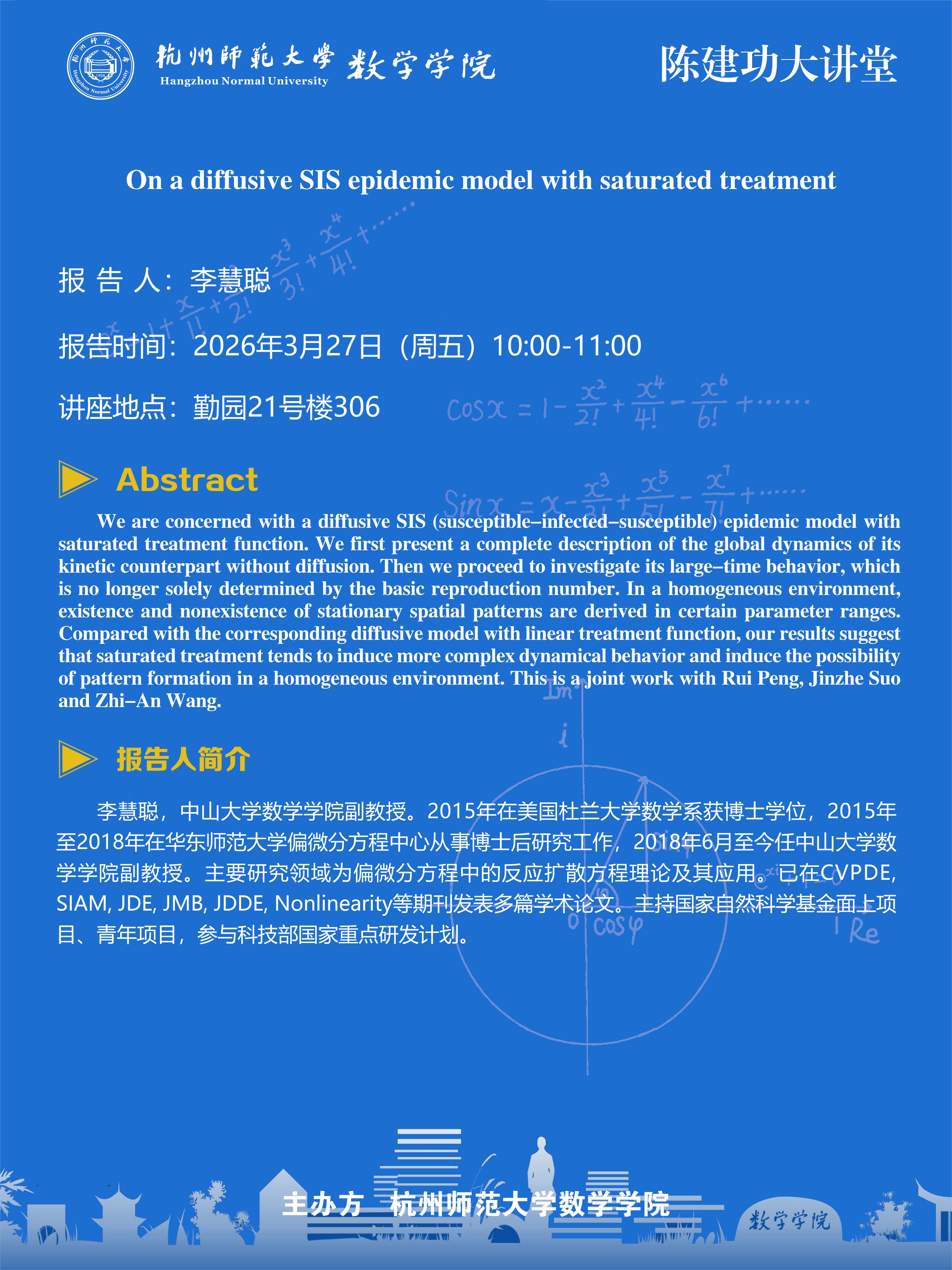 陈建功大讲堂(2026-10):On a diffusive SIS epidemic model with saturated treatment
