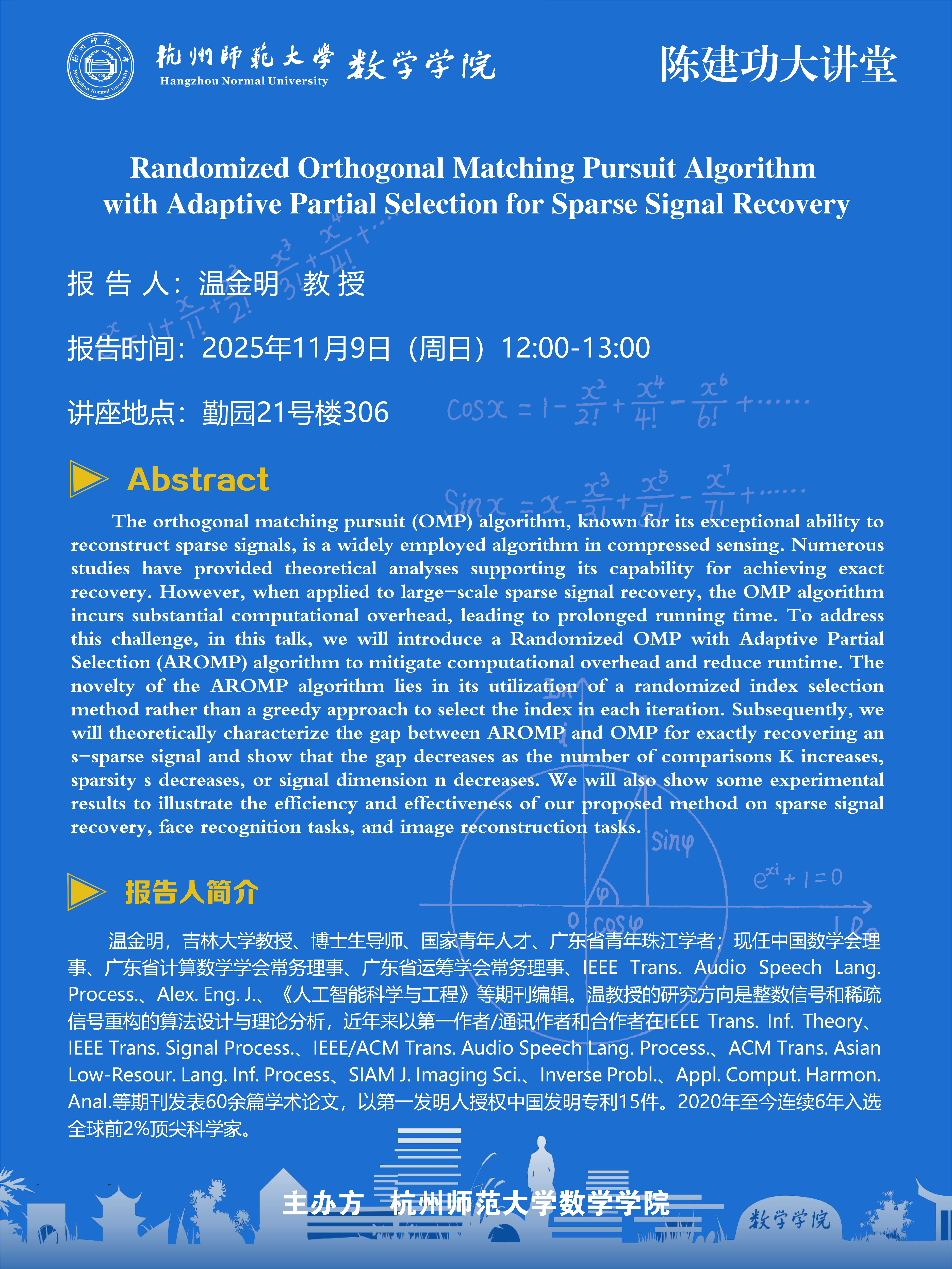 陈建功大讲堂(2025-123):Randomized Orthogonal Matching Pursuit Algorithm with Adaptive Partial Selection for Sparse Signal Recovery