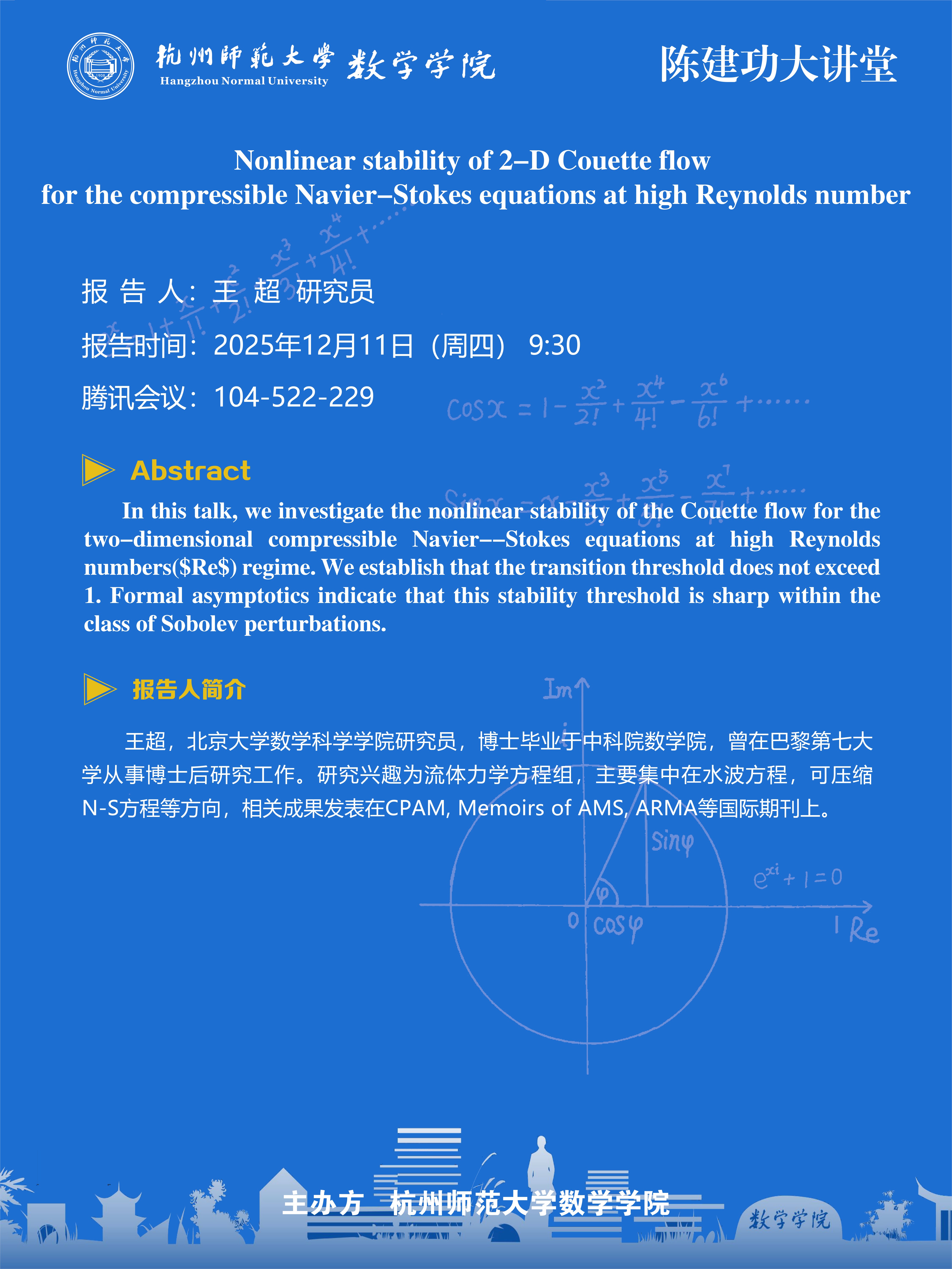 陈建功大讲堂(2025-154):Nonlinear stability of 2-D Couette flow for the compressible Navier-Stokes equations at high Reynolds number