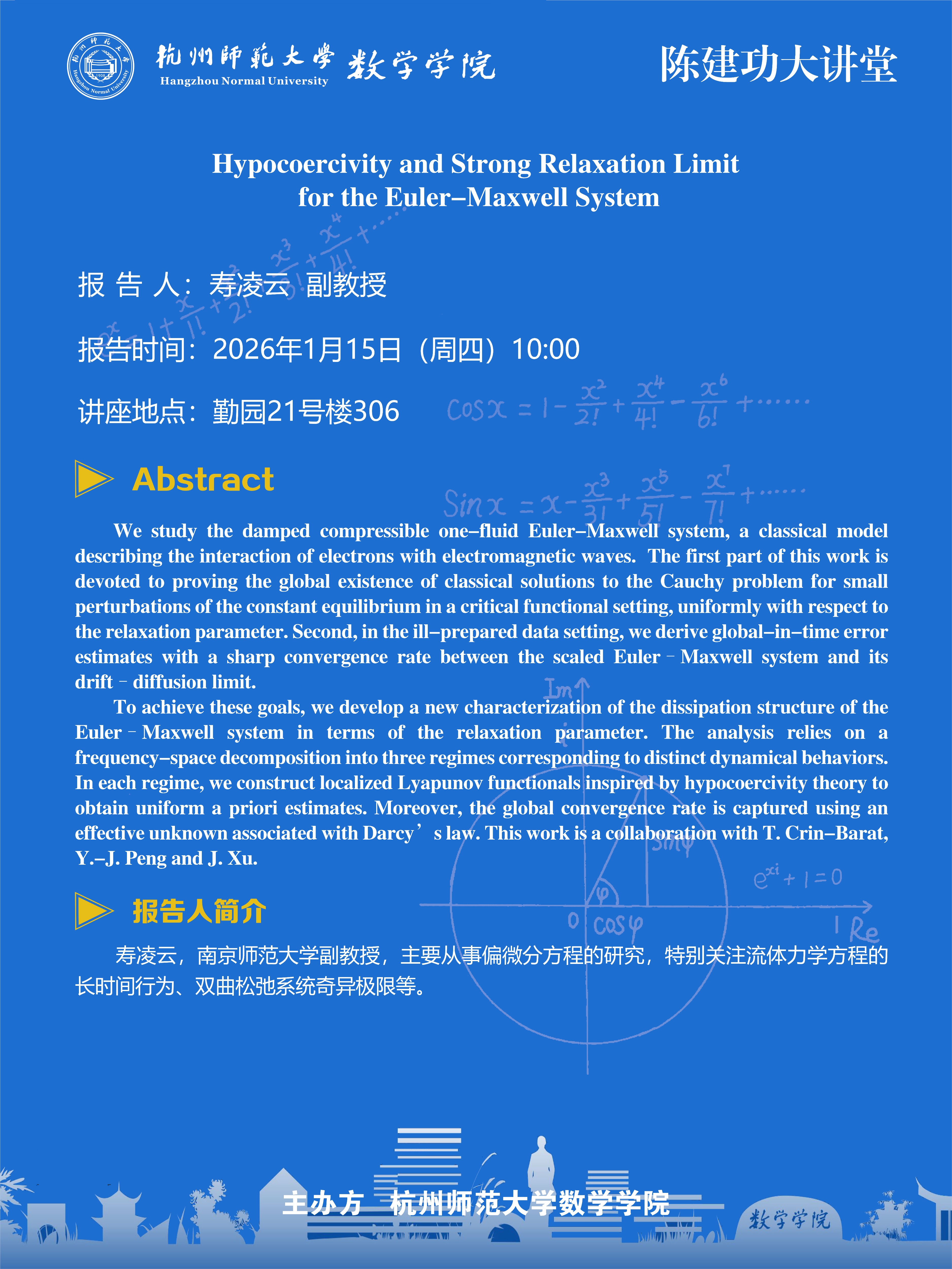 陈建功大讲堂(2026-5):Hypocoercivity and Strong Relaxation Limit for the Euler–Maxwell System