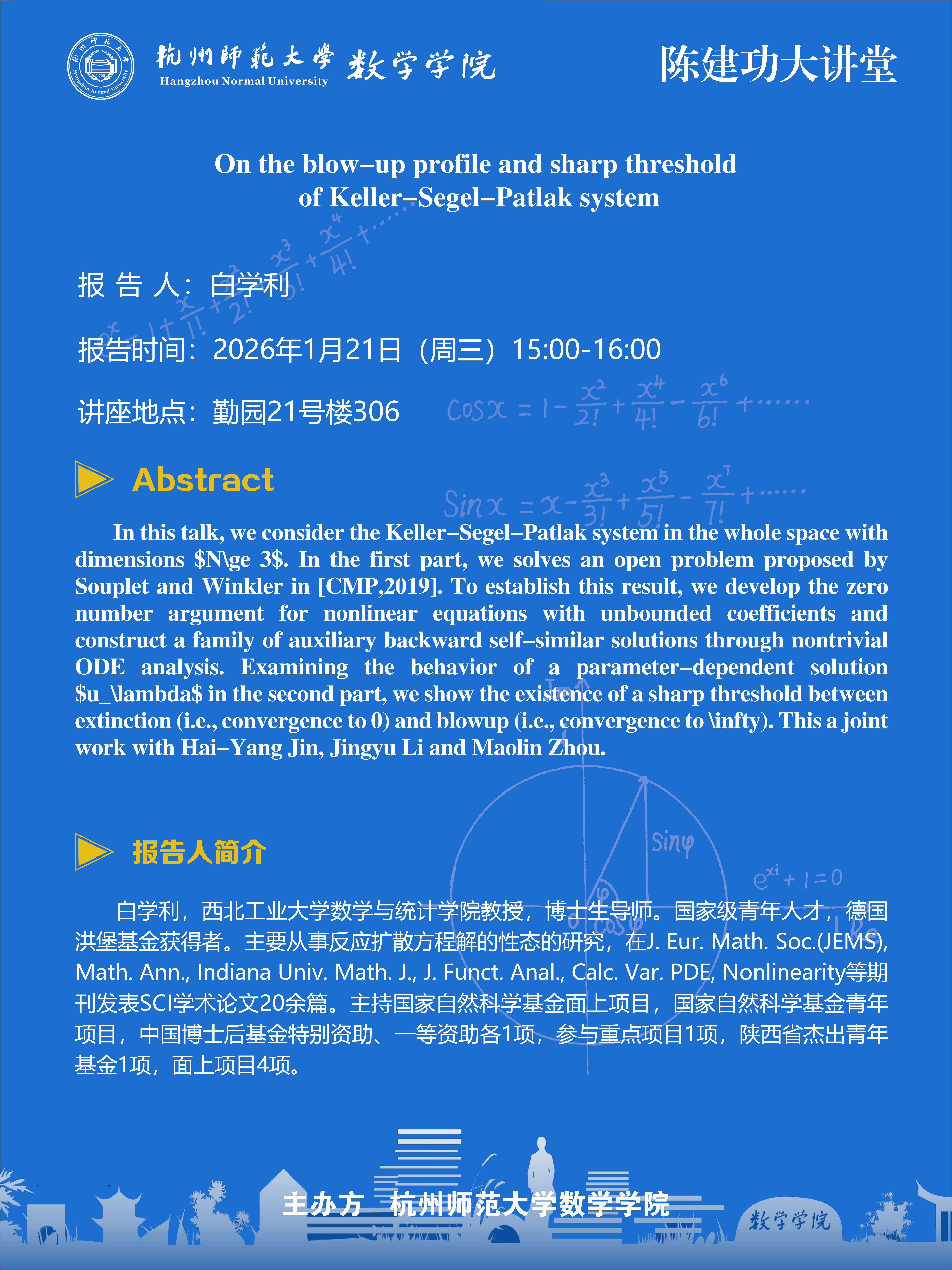 陈建功大讲堂(2026-6):On the blow-up profile and sharp threshold of Keller–Segel–Patlak system