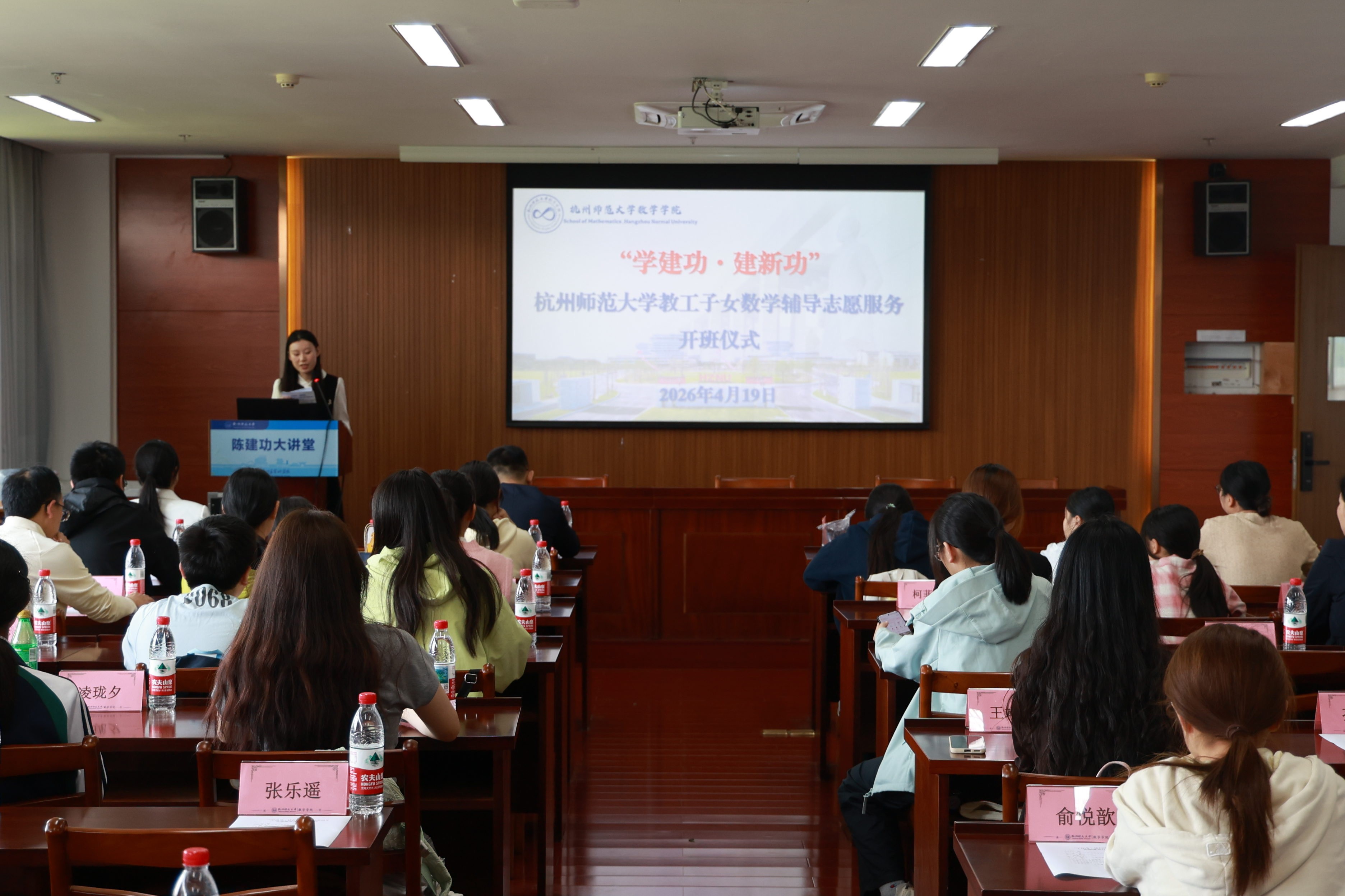 为深入贯彻落实立德树人根本任务,精准对接教工子女数学辅导需求,弘扬陈建功先生育人精神。2026年4月19日下午,杭州师范大学数学学院“学建功·建新功”教工子女数学辅导志愿服务开班仪式在勤园21-308举行。学院党委副书记李庆龙、团委史家宁老师,“建功服务团”全体志愿者及结对家长学生代表齐聚一堂,共启薪火相传的数学探索之旅。