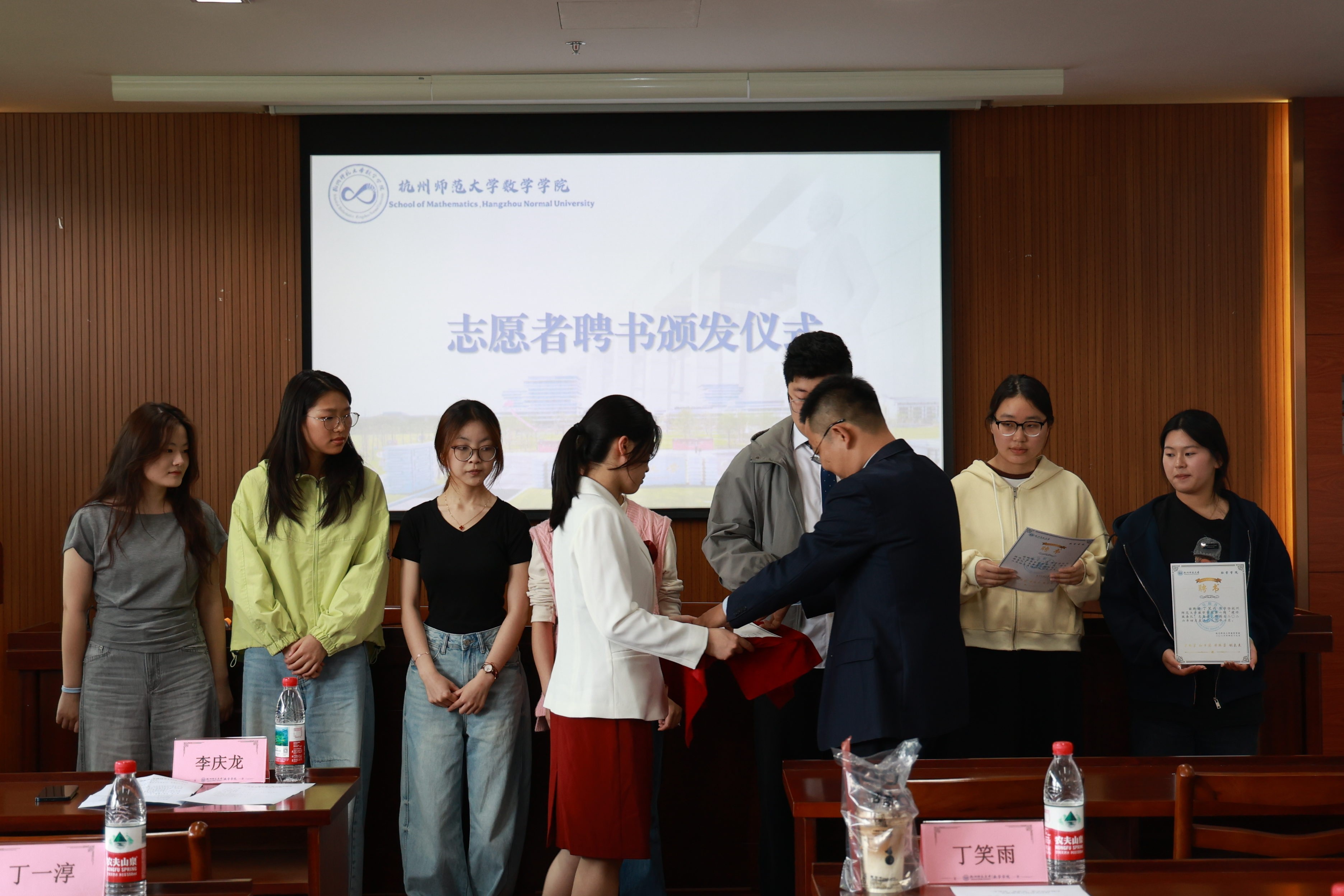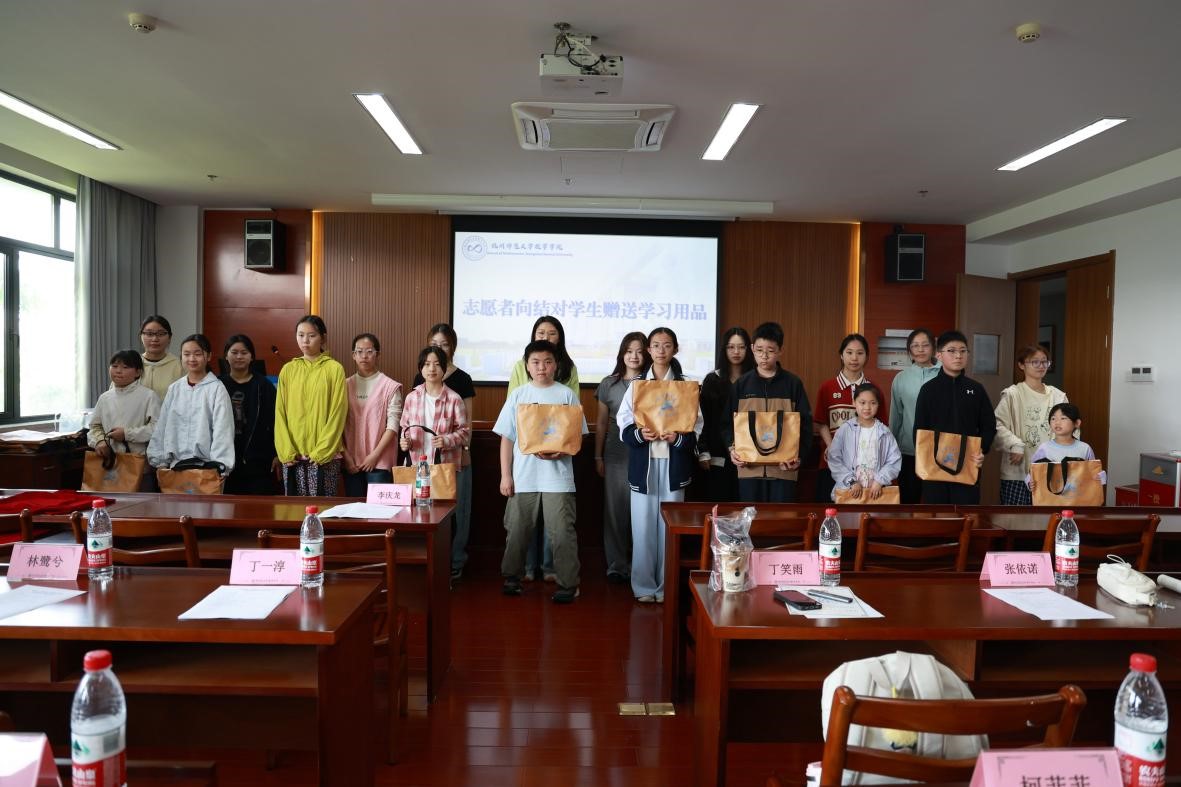 赠礼与聘书颁发环节,李庆龙副书记将承载学院信任与嘱托的聘书交于志愿者手中。随后,志愿者代表向结对学生赠送了精心准备的学习用品,寄托着对小朋友们勇攀数学高峰的殷殷期许与美好祝愿。
